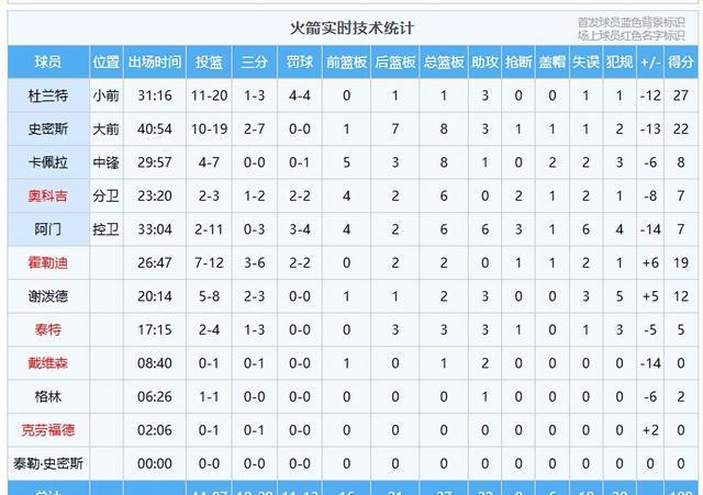 火箭数据:杜兰特27分3助、史姑娘22分8板3助、霍勒迪19分2板、谢泼德12分2板3助、卡佩拉8分8板1助2帽、阿门7分6板6助3断、奥科吉7分6板2断、泰特5分3板3助、格林2分1助、戴维森1板2助