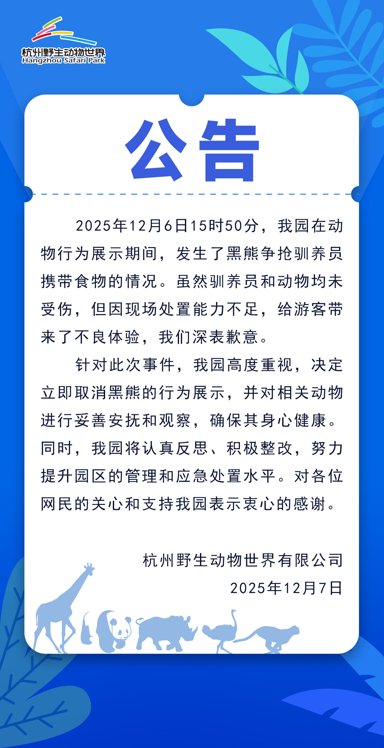 发布日期:2025-12-17 12:01 点击次数:157杭州野活泼物全国12月7日公告:2025年12月6日15时50分,我园在动物动作展示时辰,发生了黑熊争抢驯养员佩戴食品的情况。天然驯养员和动物均未受伤,但因现场惩处才智不及,给搭客带来了不良体验,咱们深表歉意。