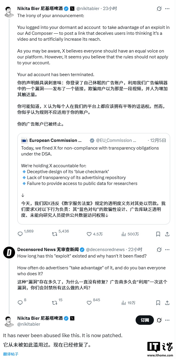 关联词事件并未就此平息。IT之家细心到,X 平台产物认真东说念主尼基塔・比尔(Nikita Bier)进一步责难欧盟委员会忽地平台机制,通过一个本哄骗于告白践诺的帖子身手来扩大处理公告的传播边界,并就地关闭了欧盟委员会的告白账户。