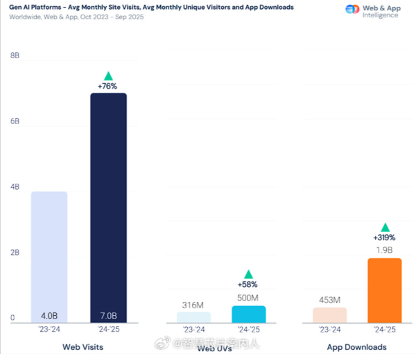 数据透露,众人生成式AI劳动在2025年9月达到约70亿次的月考察量,同比增长76%,这一畛域已可与Instagram等主流轻率集聚匹敌。挪动端发达更为隆起,往常一年AI利用使用会话数增长五倍,利用下载量飙升778%。