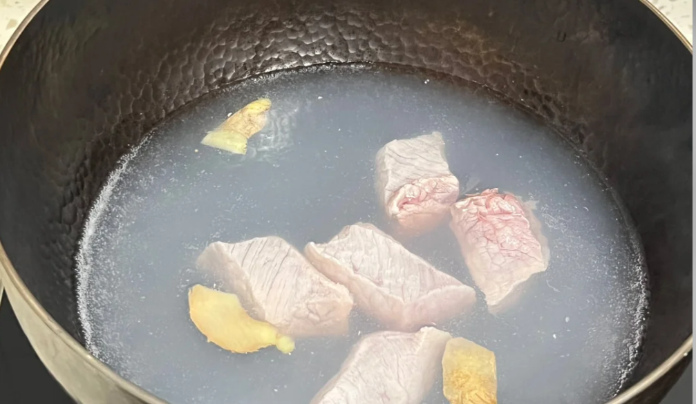 2:将精瘦肉去掉筋膜,然后切成大一些的块,然后起锅烧一些净水,瘦肉要冷水下锅焯水,加上一丝料酒,放入一些葱段,把瘦肉煮几分钟,逼出血沫和血腥物资,用水冲洗掉名义浮沫即可。