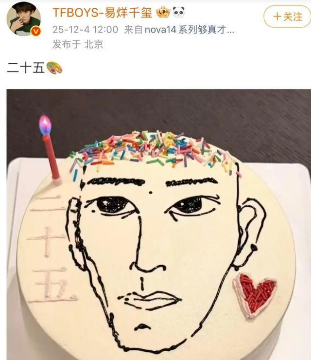 那是易烊千玺亲手用奶油画的自画像,还专诚弄上了只须老粉才老到的眉心痣和泪痣,可谓是很是全心。