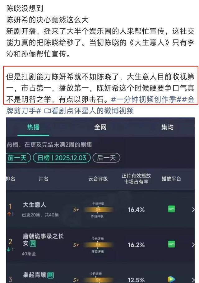 更有网友直肚直肠,称陈妍希此次在新剧上和陈晓“打擂台”是“以卵击石”,还绝不客气地指出,陈妍希的抗剧才略不如陈晓。