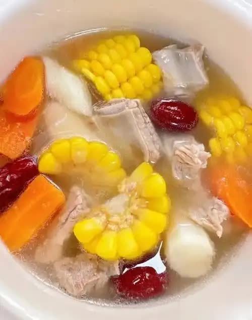 3. 将排骨、胡萝卜、玉米放入汤锅中,加入鼓胀的净水,放入姜片、葱段,大火烧开后转小火炖煮 1.5 - 2 小时。