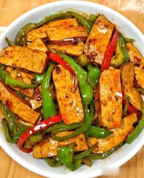 3. 翻炒豆干:加入豆干片,转中大火翻炒2分钟,直到豆干边际微微焦黄。