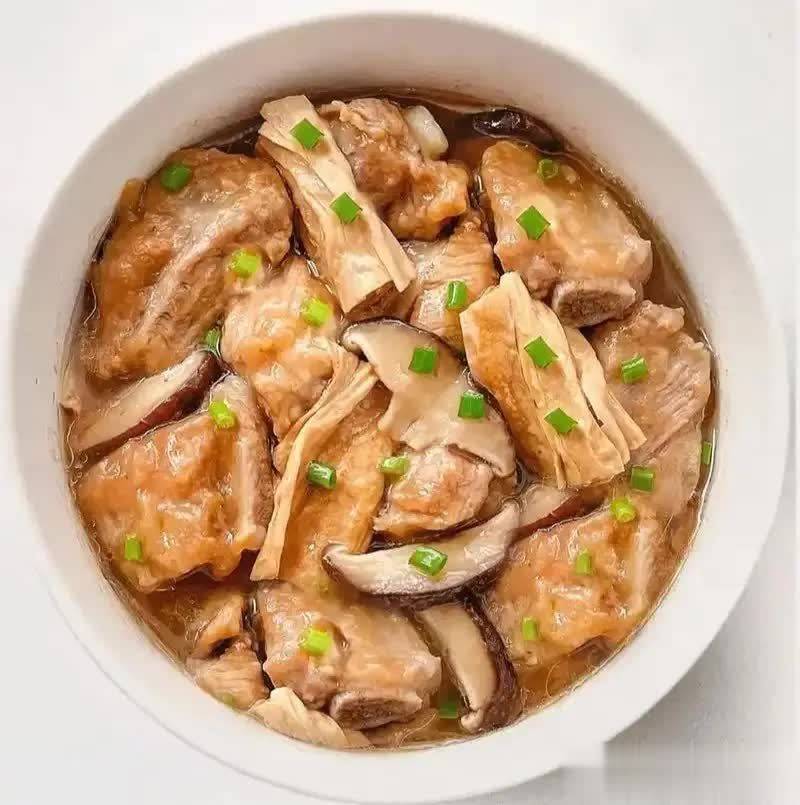 2. 蒸碗铺泡发的腐竹、香菇,放排骨及剩余料汁,水开后蒸50-60分钟即可。