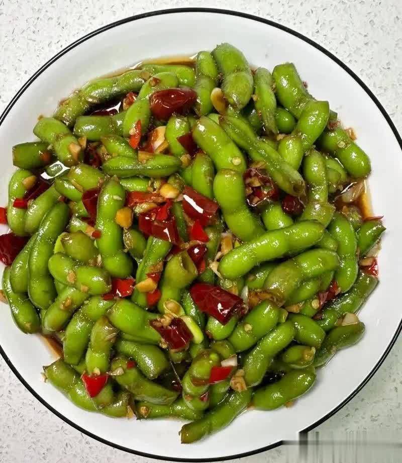 食材:簇新毛豆300克(要选豆荚鼓胀的),蒜4瓣切末,干辣椒3个剪段,生抽2勺,香醋1勺,白糖半勺,盐和香油适量。