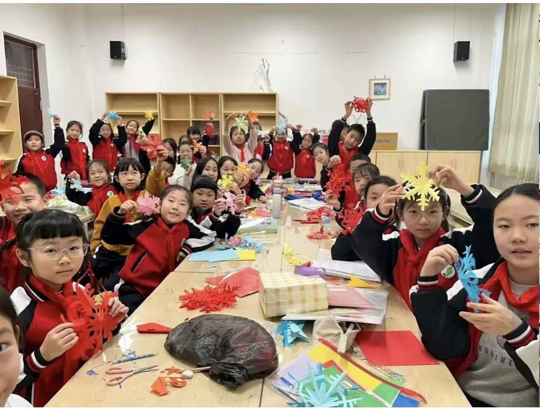 图为松原市逸夫小学的学生们展示冰雪主题剪纸作品(受访者供图)在滑雪场内